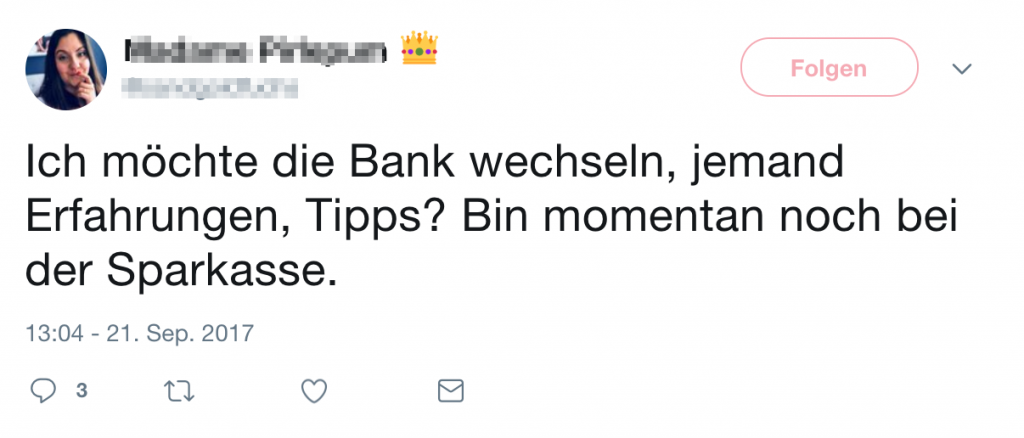 Sucht eine Person nach Tipps und Erfahrungswerte bezüglich einer neuen Bank auf den diversen Social Media-Kanälen, so kann man als Unternehmen (in diesem Fall als Finanzdienstleister) mit Hilfe von SentiOne React direkt von einer Plattform aus antworten. SentiOne ist die All-in-One-Lösung im Social CRM-Bereich.