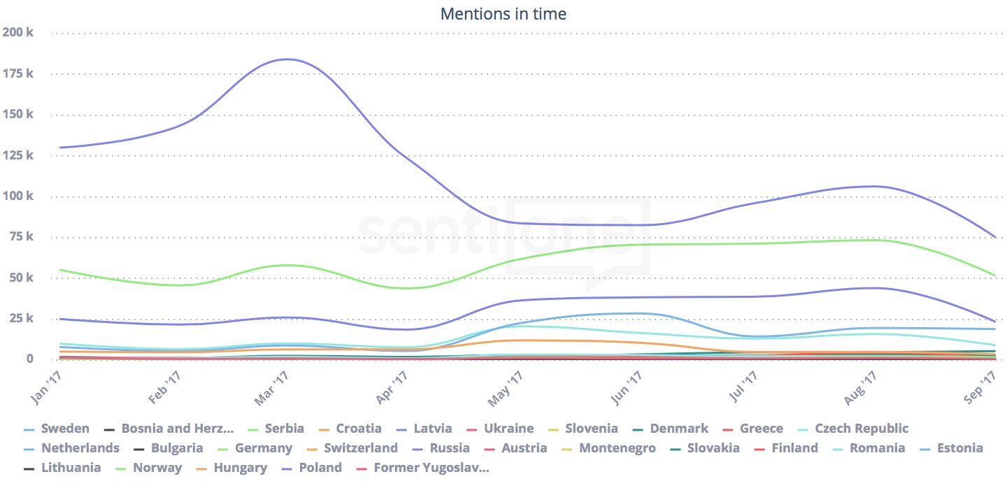 Egész Európát lefedő online listening cégként megvizsgáltuk a ‘Bitcoin’ és az ‘Ethereum’ kulcsszó megjelenési gyakoriságát Európa 27 országára vonatkoztatva is (2017. január 1. – október 11). Az említések gyakorisága alapján a Bitcoinról legtöbbször az oroszok, a németek, a lengyelek és a hollandok beszélnek online. Az Ethereum esetében a holland-lengyel pozíció cserélődik fel. Magyarország ugyanakkor mindkét esetben az élmezőnyben van: ötödik vagy épp hatodik helyen!