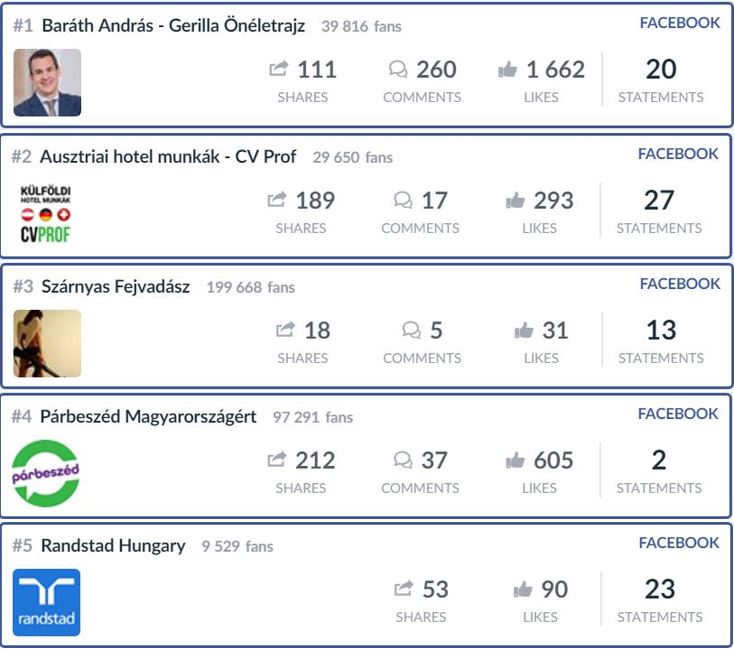 Azok az online felhasználók, akik a legnagyobb becsült eléréssel bírnak. Azaz, akik az Álláshirdetők és -hirdetések online véleményvezérei. Sokszínű a paletta, de a HR és fejvadász cégek vezetik a listát. Valamint Baráth András karrier-tanácsadó és okleveles önéletrajz-szakértő több mint 50 000-es követői bázissal rendelkező Facebook oldala is igazán meggyőző volumennel leadeli a véleményvezérek TOP5 helyezettjét.