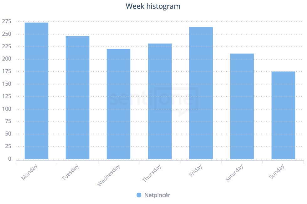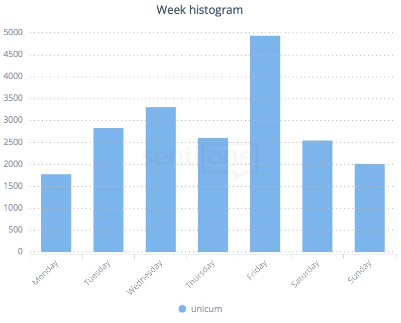 Az internet önhatalmúlag dönt, hogy melyik napot választja kedvencének adott – bármilyen – témával, márkával, trenddel kapcsolatban. Ugyanakkor ezt ismerve a SentiOne felhasználó már fókuszáltan tudja felkutatni a miérteket, formálni a márkakommunikációt, vagy épp strukturálni az online tartalomstratégiát az adatokkal igazolt tények és trendek tükrében.