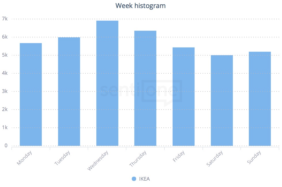 A hét közepén nagyot megy az IKEA, a 2017-es adatokat nézve. Hétvégén pedig elhalkul. Sőt! Pont hétvégén születik a legkevesebb említés a márkával kapcsolatban – legyen az Instagram poszt, Facebook komment vagy épp egy Tweet.