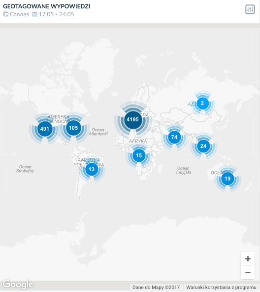 Jak widać, dostosowując się do sieciowych trendów (m.in. uwzględniając używanie hashtagów) niektóre frazy specjalnie napisaliśmy łącznie. Taki zabieg pozwolił nam zebrać prawie 20% więcej wzmianek, niż przy użyciu samego słowa “Cannes”.