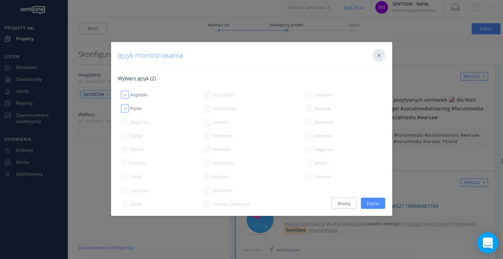 Na początku przygody z monitoringiem internetu nie każdy jest zaawansowanym użytkownikiem – dlatego w SentiOne dostępne są trzy podstawowe scenariusze projektów. Z czasem jednak wielu użytkowników wchodzi na coraz wyższy poziom – aby ułatwić im zmianę już stworzonego projektu na bardziej zaawansowany, wystarczy kliknąć “Zaawansowana konfiguracja”.