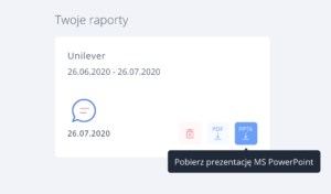 Mamy dla Was cudowną nowinę – raportowanie Waszych działań online nigdy nie było prostsze! Od dzisiaj raporty SentiOne dostępne są w formacie PDF jak i PowerPoint. Co to oznacza? Wszystkie wykresy, statystyki i analizy można pobierać w formacie pptx i dostosować do Waszych potrzeb – zmieniać slajdy, edytować wykresy, dodawać komentarze, porównywać wyniki – co tylko potrzebujecie! Możliwość pobrania raportów w formacie pptx zostanie włączona wszystkim użytkownikom SentiOne automatycznie od dnia 20 września 2020. W razie problemów prosimy o kontakt z obsługą klienta poprzez czat na naszej stronie!