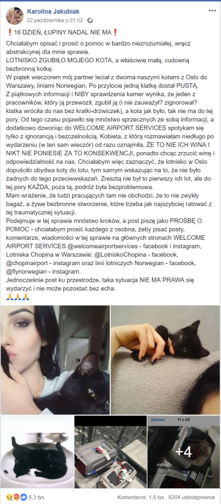 Partner Karoliny (autorki słynnego posta) wracał z dwoma kotami z Oslo. Nadał dwie kocie klatki na lotnisku wylotowym i otrzymał dwie na lotnisku przylotu. Niestety… jedna była otwarta i pusta. Minął piątek wieczór, weekend i w poniedziałek rano Karolina opublikowała post z prośbą o wywarcie presji na wszystkich możliwych podmiotach. Kota jak nie było, tak nie ma.