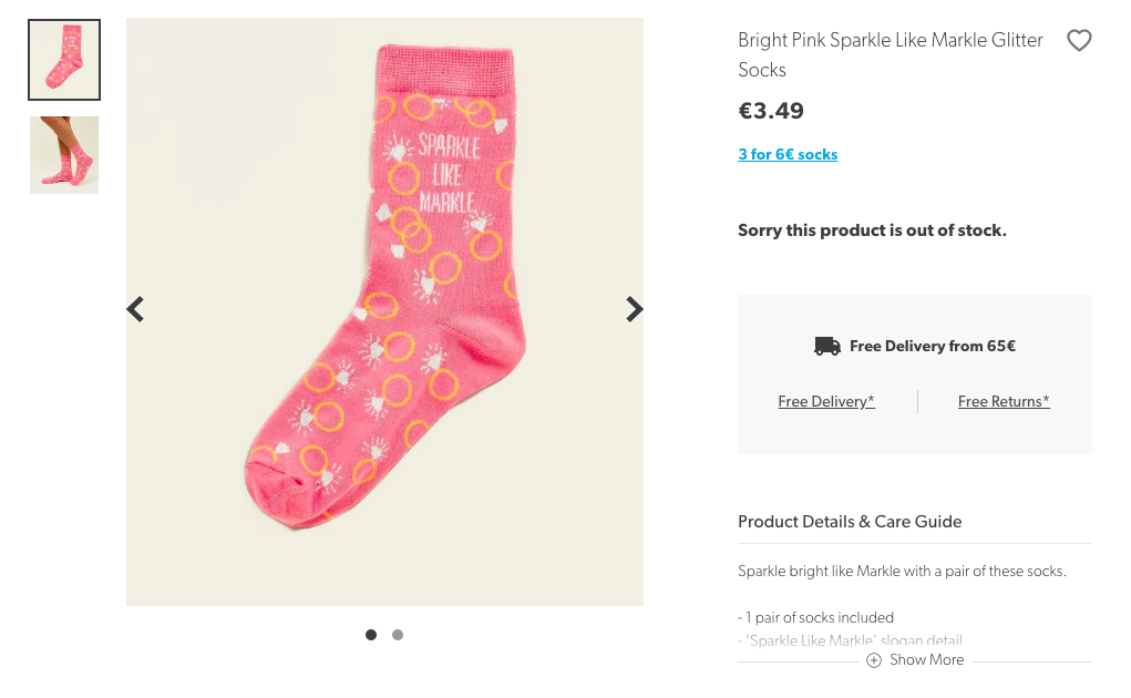 Innym interesującym przykładem jest limitowana edycja skarpetek wypuszczona przez brytyjską sieć sklepów New Look, ozdobiona hasłem “Sparkle like Markle” (błyszcz jak Markle) – to hasło było w ostatnim czasie mocno eksploatowane przez producentów takich okołoślubnych gadżetów jak koszulki czy kubki. Skarpetki ze sloganem zostały szybko wyprzedane i prawdopodobnie dumnie zdobiły stopy fanów monarchii w tym wielkim dniu.