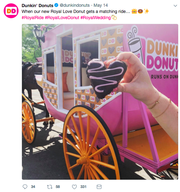 Nie istnieje bardziej spektakularny środek transportu dla książęcej pary niż karoca – najwidoczniej Dunkin’ Donuts podziela to zdanie, co udowadnia ich specjalnie zaprojektowany na ten dzień wehikuł. Na tym luksus się nie kończy – do przejazdu dołączone były przygotowane specjalnie na tę okazję donuty.