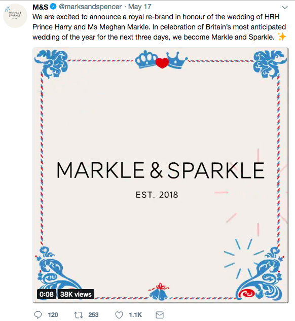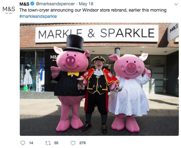 Jedno z najbardziej spektakularnych działań RTM niewątpliwie należało do brytyjskiej sieci sklepów Marks&Spencer, która na cześć księżnej Meghan tymczasowo zmieniła swoją nazwę na Markle&Sparkle. Miało to miejsce nie tylko w mediach społecznościowych – w sklepie w Windsorze został również zmieniony główny szyld, a o wszystkim poinformował specjalnie zatrudniony herald miejski!