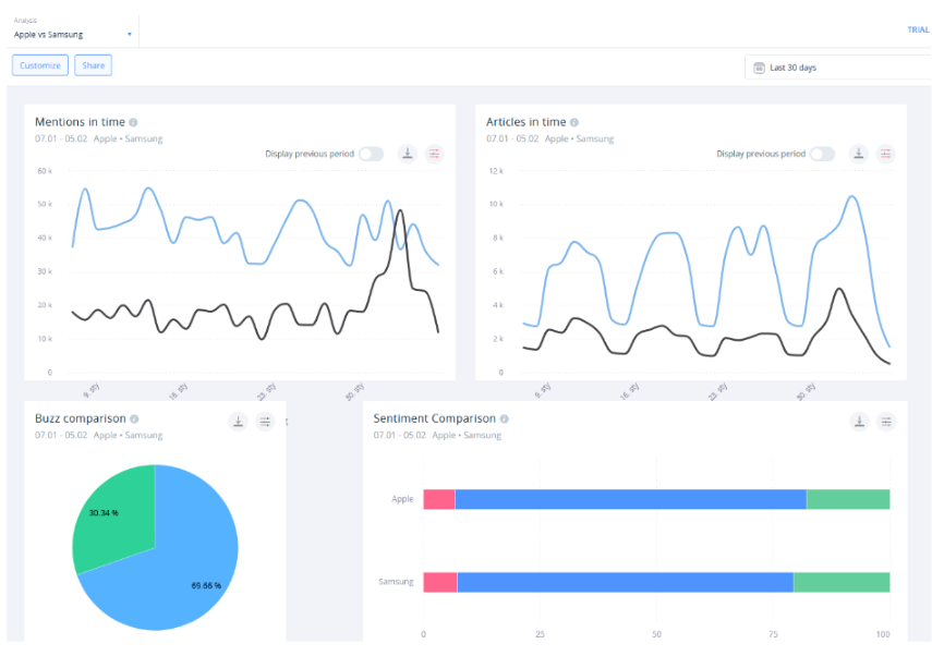 Pomimo swojej nazwy, monitoring marki nie jest ograniczony do pojedynczej firmy. Rynek wymaga, by regularnie porównywać się z konkurencją — a SentiOne Listen zapewnia doskonałe narzędzia do tego zadania.