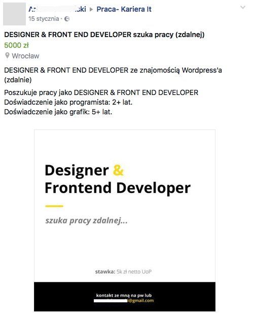 Przykładowe ogłoszenie poszukującego pracy na Facebooku.