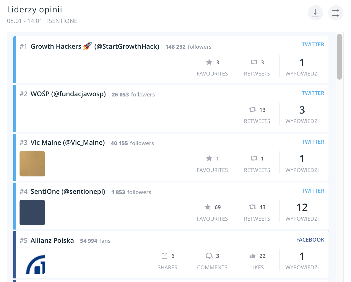 #5 poznać najpopularniejsze wzmianki (na podstawie zasięgu) i ich autorów  (liderów opinii), którzy angażują potencjalnych konsumentów