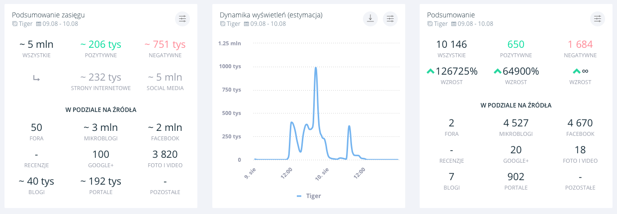 Liczby z systemu SentiOne są dla Tigera bezlitosne – w ciągu 24 godzin cała sytuacja dotarła do pięciu milionów internautów. Na temat marki wzmiankowano ponad 10 tysięcy razy, w zdecydowanej większości – negatywnie.
