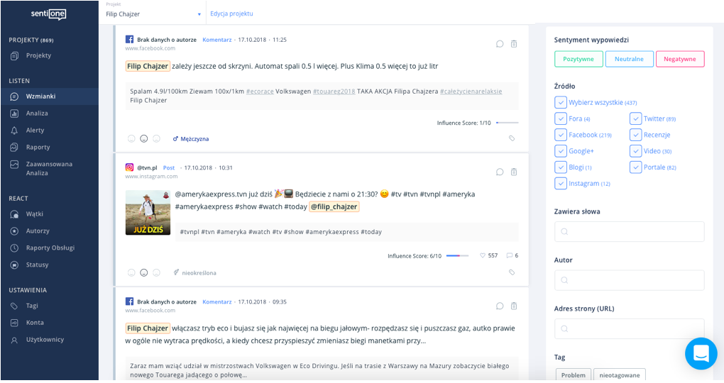 Po pierwsze – tworząc w SentiOne projekt zawierający swoje imię i nazwisko lub nazwę prowadzonego kanału. Takie rozwiązanie pomoże nie tylko zagregować treści z różnych źródeł (social media, fora dyskusyjne, blogi) do jednego miejsca, co ułatwi odpowiadanie na wypowiedzi fanów…