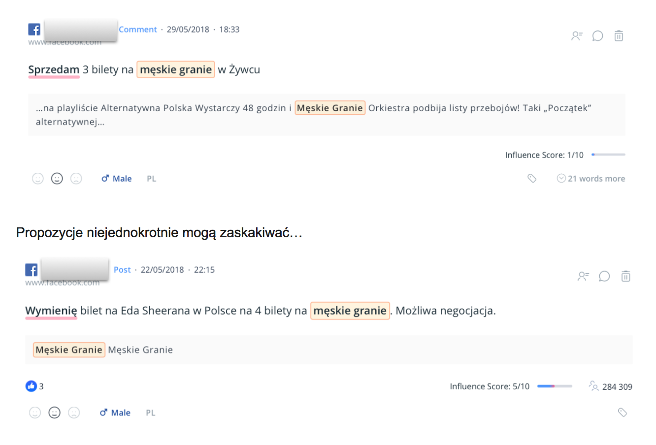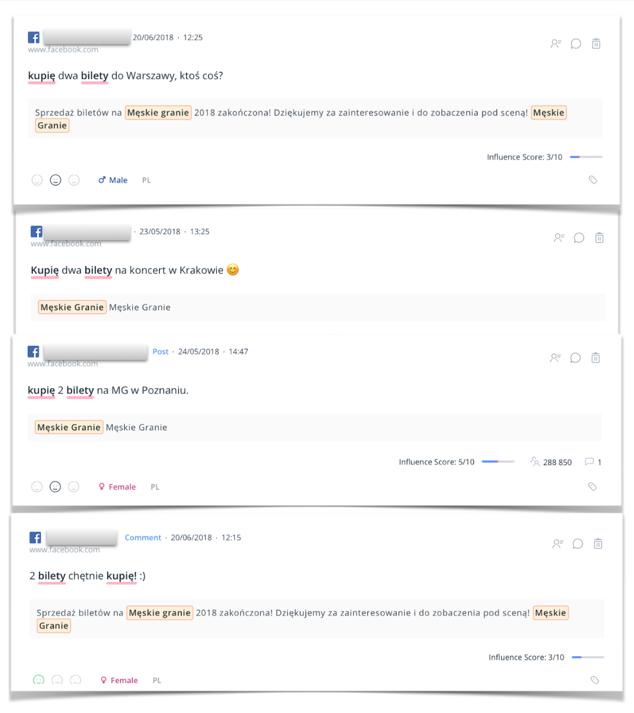Powyżej kolejne piki obrazujące dynamikę dyskusji w czasie, podczas letnich tras koncertowych w 2016, 2017 i 2018 roku. Najwięcej emocji, a co za tym idzie wzmianek, poza tegorocznym finałem w sierpniu, przypadło na dzień, w którym ruszyła sprzedaż biletów online. Na wykresie w 2018 widoczny jest pierwszy termin, w którym miała ruszyć przedsprzedaż biletów, a wystąpiły problemy techniczne dystrybutora. Drugi odroczony o kilka dni skok liczby wypowiedzi zgrywa się z dniem, kiedy to bilety rozeszły się w zalediwe kilkanaście minut.