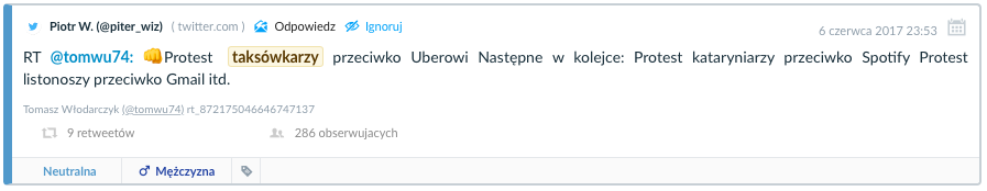 Podeszliśmy do tematu niestandardowo, zadając pytanie: “Czy według internautów protestujące korporacje odniosły sukces?”, Niestandardowo, bo stawiając takie pytanie badawcze wszystkie wzmianki przeciwko taksówkarzom (także te pochwalne w stronę Ubera) zakwalifikowaliśmy, jako negatywne i na odwrót – to, co złe na temat amerykańskiego startupu, na potrzeby raportu uzyskało wydźwięk pozytywny.