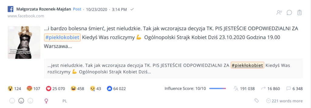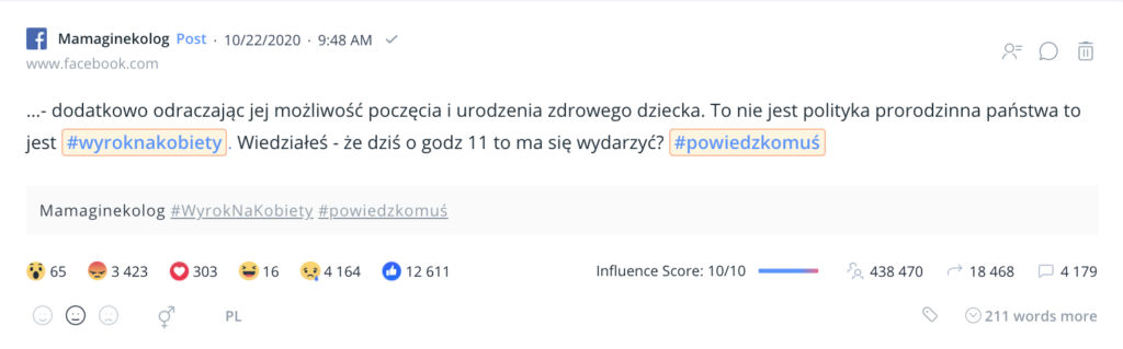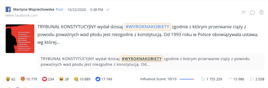 22 października 2020 roku temat zaostrzenia aborcji na nowo wzbudził dyskusję w internecie – tym razem za sprawą orzeczenia Trybunału Konstytucyjnego. Internet zawrzał, a naprędce wprowadzony zakaz zgromadzeń, tylko spotęgował gniew w sieci. W ciągu zaledwie czterech dni (tekst ten jest pisany w niedzielę 25.10) #StrajkKobiet zyskał już 308 tysięcy wzmianek oraz wygenerował zasięg na poziomie 483 milionów wyświetleń.