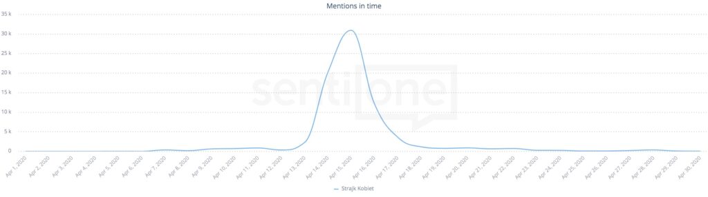 W kwietniu pod obrady Sejmu trafiła ustawa zaostrzająca prawo aborcyjne – projekt obywatelski Kai Godek. Wtedy to po raz pierwszy w roku 2020 użyto hashtagu #strajkkobiet w celu manifestacji poglądów, deklaracji jedności kobiet oraz wyrażeniu sprzeciwu wobec proponowanej ustawy. Wtedy, również z powodu pandemii, wszelkie demonstracje i manifestacje były ograniczone, tak więc wiele aktywności przeniosło się do sieci. W rezultacie, w kwietniu odnotowaliśmy 78 tysięcy wzmianek z hashtagiem #strajkkobiet, a wszystkie wypowiedzi zyskały około 144 milionów wyświetleń. Dodatkowo, 62% wszystkich wypowiedzi należało do kobiet.