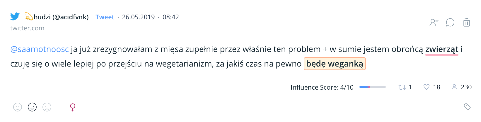 Donald Watson stworzył termin „weganizm” w 1944 roku. Od tego czasu zainteresowanie weganizmem rozwija się nieprzerwanie. Wciągu 5 lat liczba wzmianek na temat wykuczania produktów odzwierzęcych wzrosła o kilka tysięcy procent. Weganizm przestał być tylko dietą wykluczającą mięso, a zaczął całą ideologią. Najwięcej na ten temat publikują w Polsce kobiety, a trzy czwarte wspomnianych dyskusji toczy się w mediach społecznościowych. Ponieważ konfiguracja projektu w Sentione wymaga dokładnego predefiniowania badanego tematu, mój wpis porusza ledwie kilka aspektów związanych z dyskusjami na temat weganizmu w sieci. Jestem przekonana, że różne aspekty związane z byciem WEGE możemy analizować w nieskończoność.