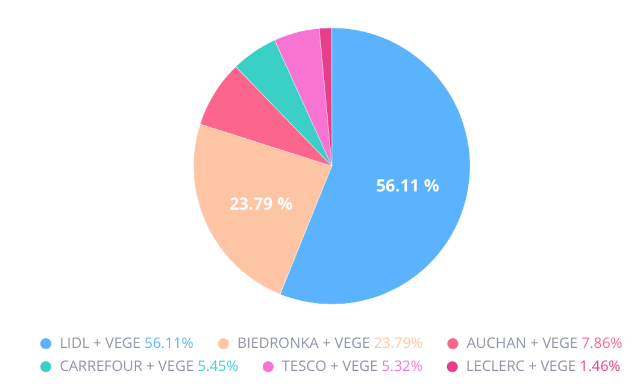 Sieci sklepów spożywczych wychodzą naprzeciw oczekiwaniom wegetarian i wegan, wprowadzają produkty bezmięsne także pod markami własnymi – są to przede wszystkim produkty spożywcze. Wegańską ofertę znaleźć można na półkach Biedronki – Food Veggie, Lidla w sekcji Naturalnie, Tesco, Carrefour, Auchan i wielu innych. Warto odnotować, że Lidl oraz Carrefour, w myśl polityki “no waste” wprowadziły w tym roku na przykład możliwość pakowania produktów garmażeryjnych we własne pojemniki klientów.
