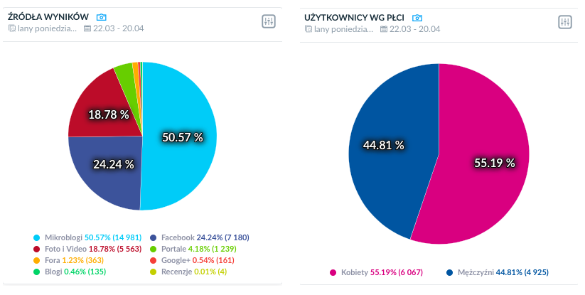 Po lewej: fraza “lany poniedziałek” w podziale na internetowe kanały. Po prawo – rozkład wzmianek wg. płci. Ujęcie miesięczne.