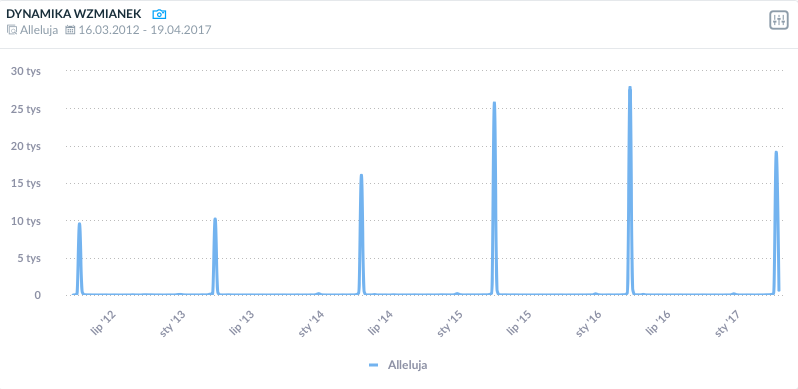 Dynamika wypowiedzi w czasie, hasło “Wesołego Alleluja!”, widok z panelu SentiOne