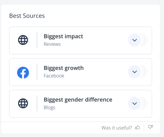 This insight shows you the best-performing sources. But that’s not all. This observation rated these sources into three main categories to see which had the Biggest Impact, the Biggest Growth, and which showed the Biggest Gender Difference.