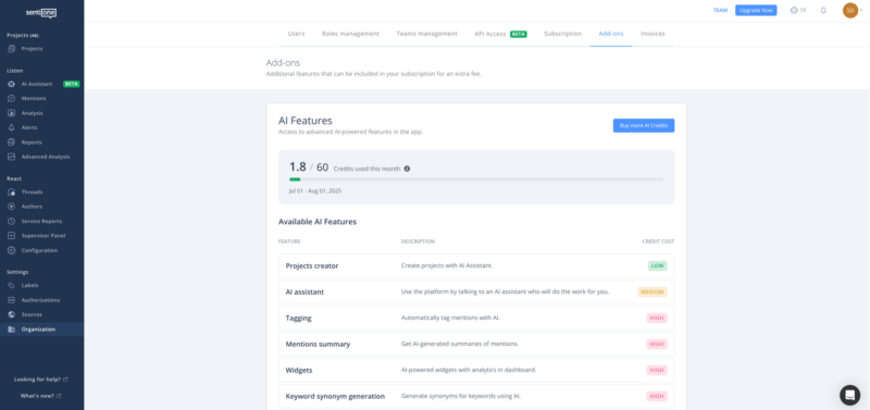 We’ve redesigned the Subscription Add-Ons view to give you a clear, unified overview of all AI-powered features linked to your plan – including credit usage, assistant capacity, and advanced automation tools.