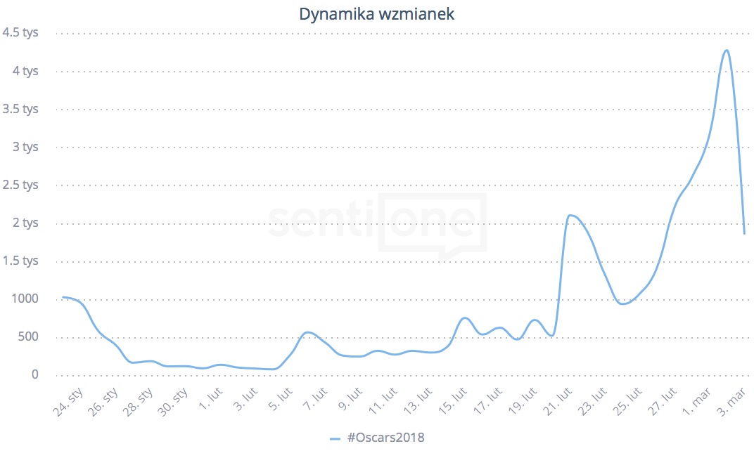 Each year, first two calendar months are crucial in terms of discussions on the topic of potential winners – press conferences, other awards’ ceremonies, such as Golden Globes or BAFTA awards, based on which many people try to predict Oscars, and finally, Academy Awards nominations – this year it took place on 23rd of January. To make the data more fair for all the nominees, we’re going to focus on the period between 23st of January, till the end of February, straight before the gala. We chose five major categories to focus on, such as Best Picture, Leading Actor, Leading Actress, Supporting Actor and Supporting Actress.